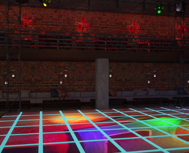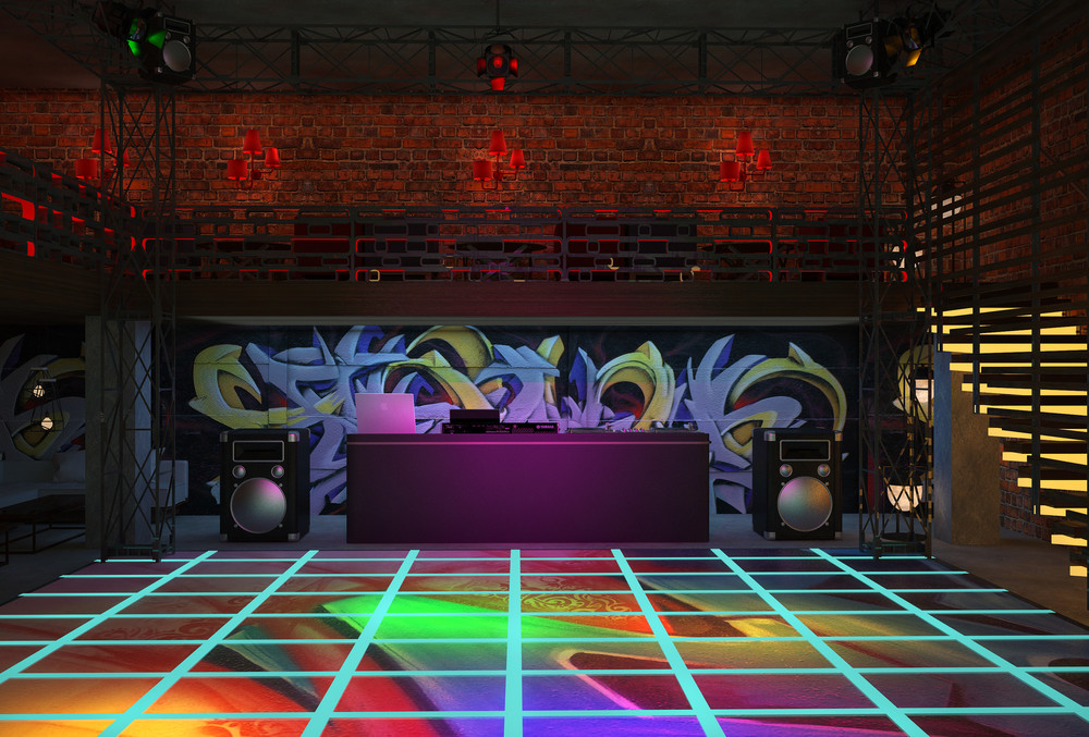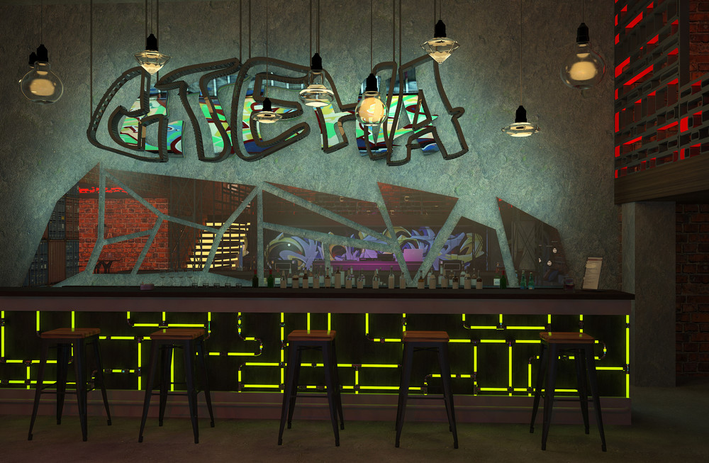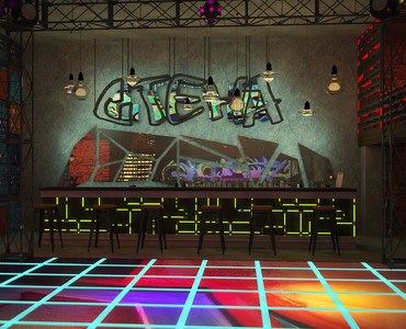 Кирпичные стены с нарисованными на них граффити, постеры, висящие тут же. Металлическая и деревянная мебель, с подсветкой. Хромированные перегородки и трубы вместо обычных светильников. Интересные лампы, напоминающие грибы или светлячков. Оригинальное решение танцпола, картинку которого можно увидеть только сверху, и то лишь на несколько секунд, ведь она постоянно будет меняться. Стойка диджея, расположенная, таким образом, чтобы ему никто не мешал. Множество обманных стен и парящая лестница. Всё это и создаёт общую атмосферу клуба, выполненную в стиле лофт.