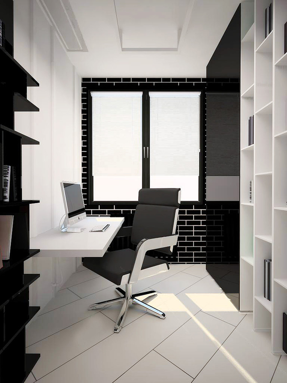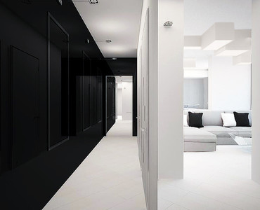 Дизайн квартиры создавался для холостого молодого человека. Основной идеей было показать борьбу черного и белого, отразить в интерьере нетривиальность мышления заказчика. Ванная комната отгорожена от гостиной электрохромным стеклом, что позволяет по желанию менять прозрачность перегородки. Для гостиной разработаны перегородки-трансформеры и полки, для детской комнаты - стеновая панель, для спальни - фотообои за изголовьем кровати.