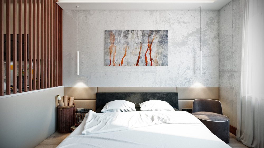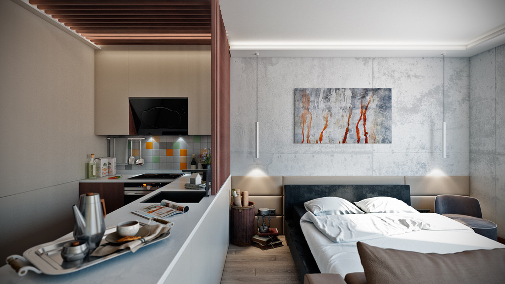 Квартира 37 м2 в одном из самых знаковых жилых комплексов "АРТ" в г. Красногорске. Капитальные стены в квартире отсутствуют, за исключением стены ванной комнаты. Мы решили приметить самые дорогие и естественные материалы: натуральный шпон, кожа, бетон, массивную доску, керамогранит. Одновременно стояла задача создать мужской и нежный интерьер, так как заказчик принадлежит к миру искусства. Стены планировали оставить в строительном бетоне, отшлифовать и покрыть защитным матовым лаком.